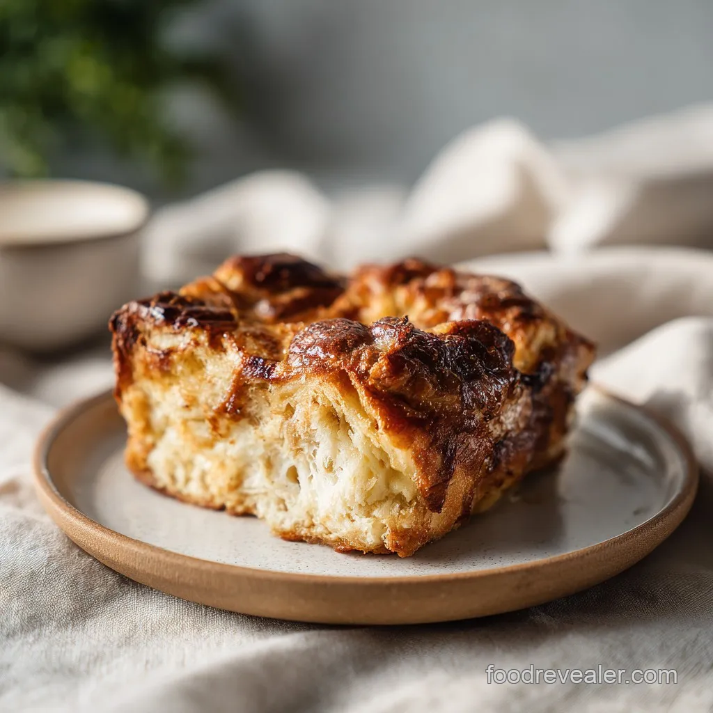 It is a baked, overnight bread pudding style breakfast. It uses cubed, custard soaked bread baked in a single dish to achieve a soft interior and a crisp, caramelized top layer.