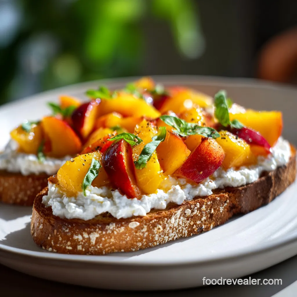 For a "Restaurant Level" presentation, use a piping bag to apply the ricotta in small, uniform mounds across the bread. This creates a beautiful, repetitive pattern. Top with the peaches, then use a pair of tweezers to place tiny basil leaves and a few edible flowers like pansies or cornflowers.